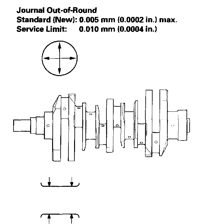 4. Measure out-of-round at the middle of each rod and main journal in two places. The difference between measurements on each journal must not be more than the service limit.