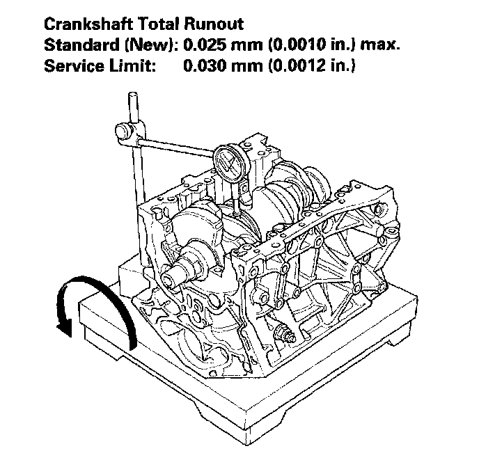 9. Measure the runout on all of the main journals. Rotate the crankshaft two complete revolutions. The difference between measurements on each journal must not be more than the service limit.