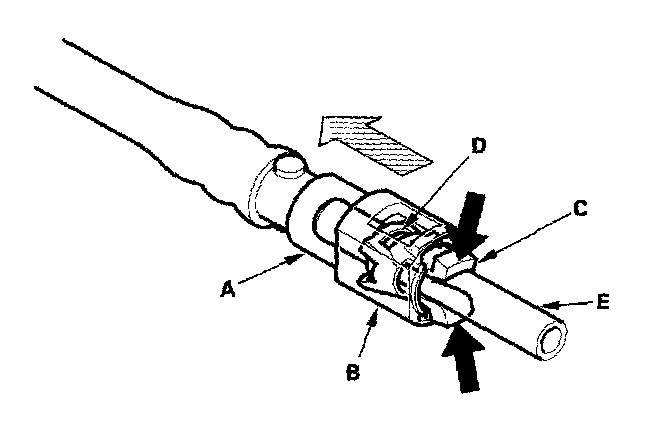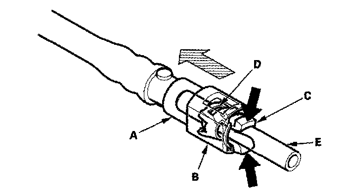 10. Disconnect the quick-connect fitting (A): Hold the connector (B) with one hand, and squeeze the retainer tabs (C) with the other hand to release them from the locking tabs (D). Pull the connector off.