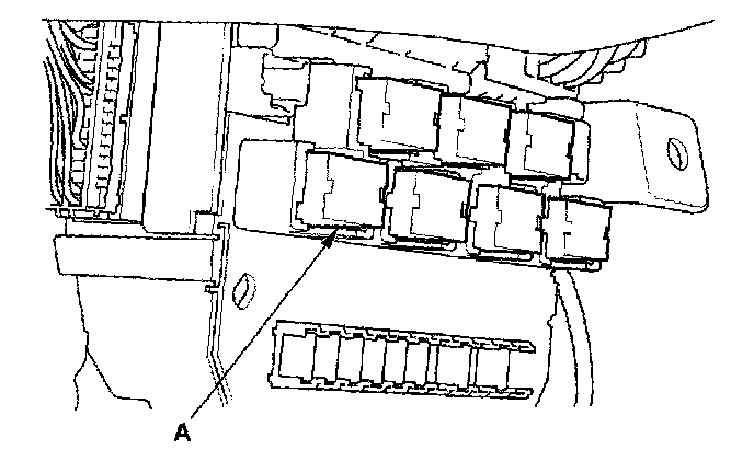 2. Remove the left kick panel, then remove PGM-FI main relay 2 (FUEL PUMP) (A) from the under-dash fuse/relay box.