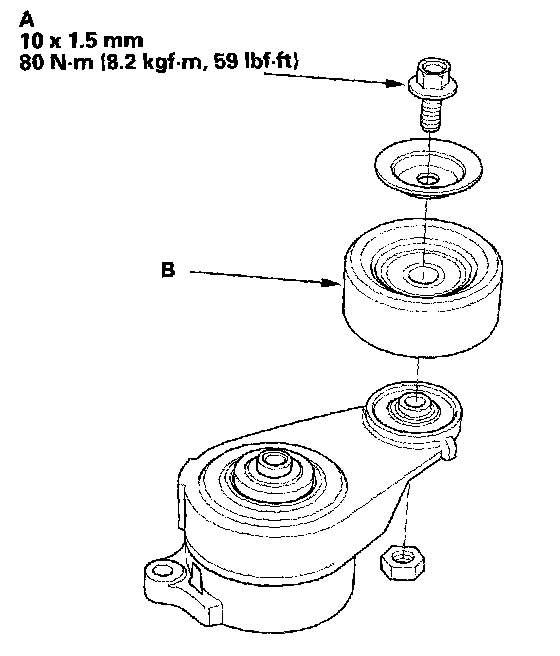 2. Remove the pulley bolt (A) (left-hand threads), and remove the tensioner pulley (B).