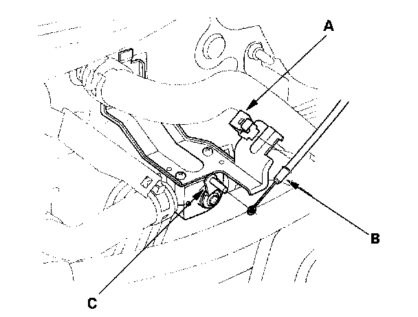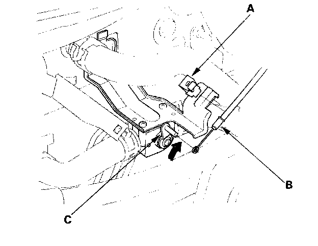 5. From under the hood, turn the heater valve arm (C) to the fully closed position as shown, and hold it. Attach the heater valve cable (B) to the heater valve arm, and gently pull on the heater valve cable housing to take up any slack, then install the heater valve cable housing into the cable clamp (A).