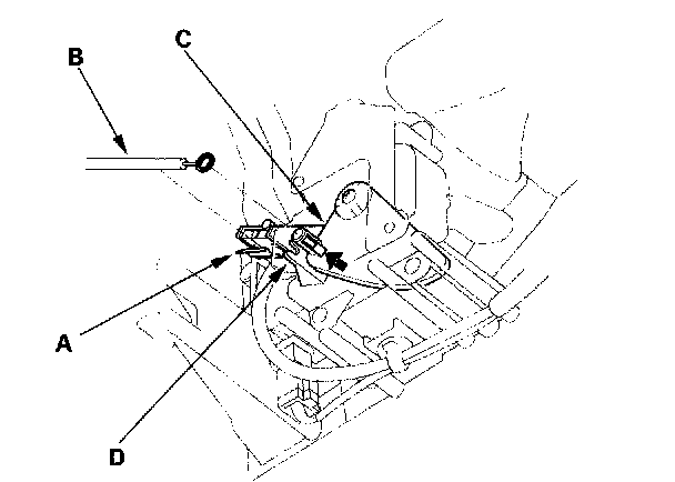 4. Attach the heater valve cable (B) to the air mix control linkage (C) as shown step 2. Hold the end of the heater valve cable housing against the stop (D), then snap the heater valve cable housing into the cable clamp (A).