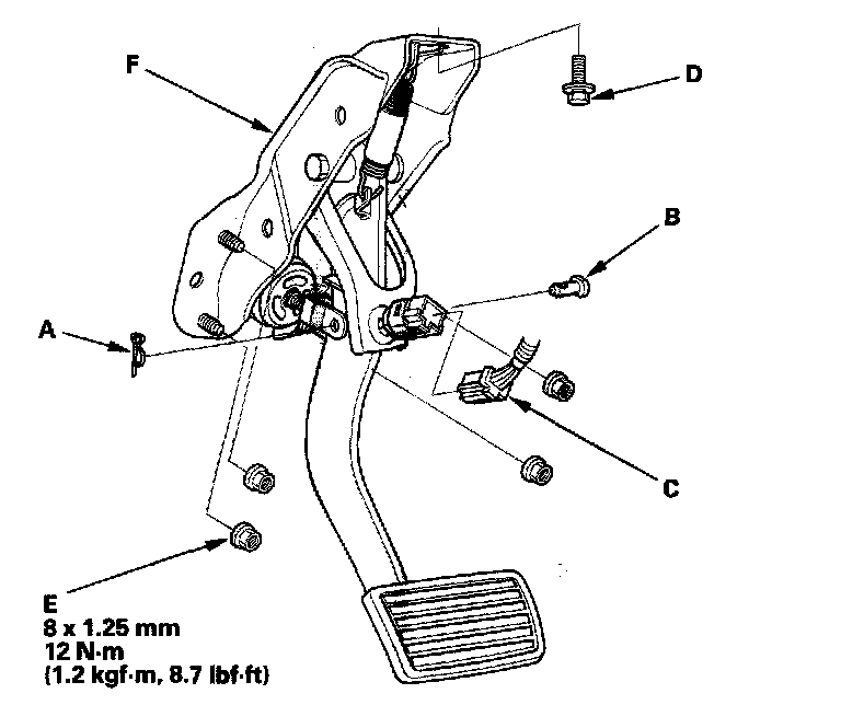 4. Remove the brake pedal with bracket (F).