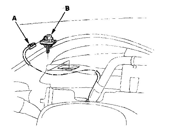 2. Disconnect the connector (A) from the driver's vent air temperature sensor. Remove the driver's vent air temperature sensor (B).
