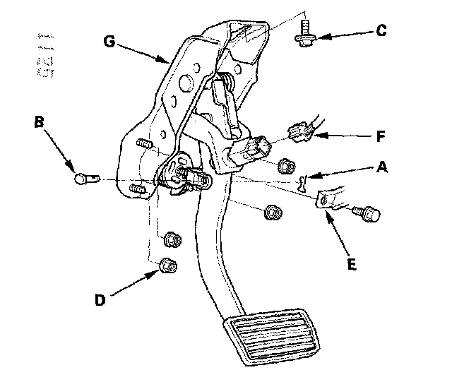 2. Remove the brake pedal bracket mounting bolt (C) and nuts (D).