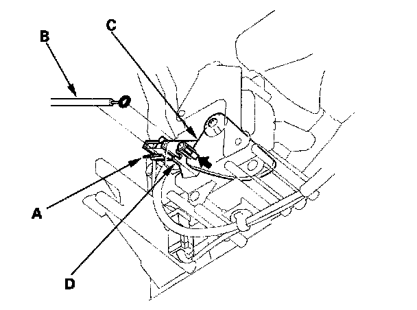 4. Attach the heater valve cable (B) to the air mix control linkage (C) as shown in step 2. Hold the end of the heater valve cable housing against the stop (D), then snap the heater valve cable housing into the cable clamp (A).