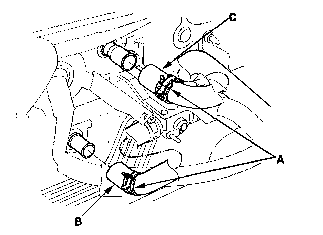 6. Slide the hose clamps (A) back. Remove the bolt and water valve bracket, then disconnect the inlet heater hose (B) and the outlet heater hose (C) from the heater unit. Engine coolant will run out when the hoses are disconnected; drain it into a clean drip pan. Be sure not to let coolant spill on the electrical parts or the painted surfaces. If any coolant spills, rinse it off immediately.