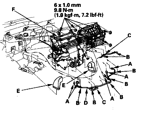 10. Disconnect the connectors (A) From the driver's air mix control motor, the evaporator temperature sensor, the power transistor, the mode control motor, passenger's air mix control motor, and the recirculation control motor, then remove the wire harness clips (B), the connector clips (C) and the wire harness (D). Remove the heater ducts (E). then remove the mounting nuts and the blower-heater unit (F).