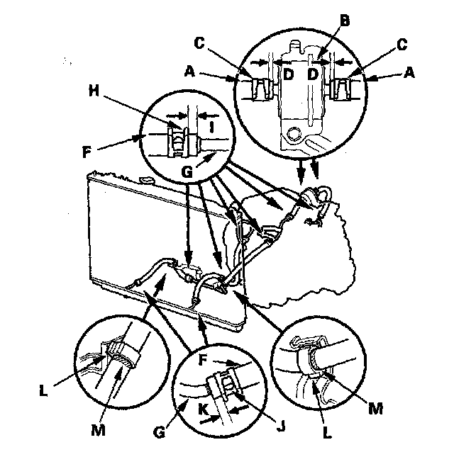 4. Secure the hoses with the clips (H) at 5 - 6 mm (0.2 - 0.24 inch) (I) from the hose ends, and secure the hoses at the ATF cooler with the clips (J) at 2 - 4 mm (0.1 - 0.2 inch) (K) from the hose ends.