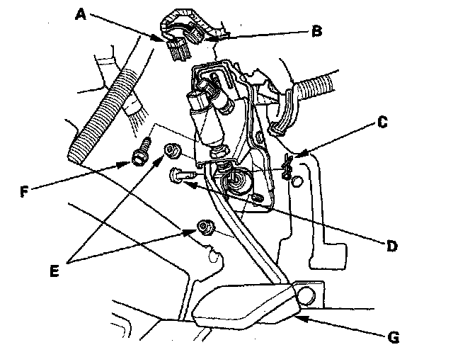 8. Connect the clutch pedal position switch connector (F) and clutch interlock switch connector (G).