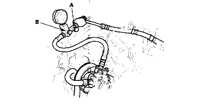 2. Disconnect the pump outlet hose (A) from the pump outlet with care so as not to spill the power steering fluid on the frame and other parts. Install the P/S joint adapter (pump) on the pump outlet (B).