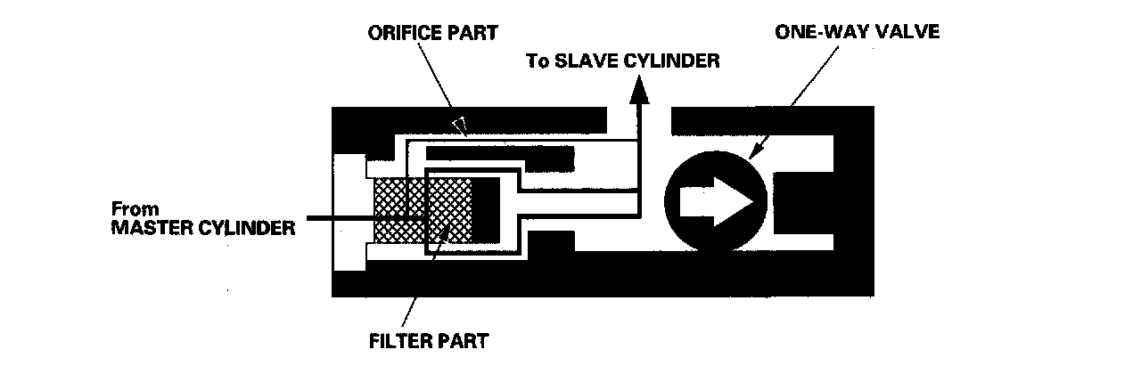 When the clutch pedal is pressed, the fluid pressure from the master cylinder moves the one-way valve in the direction shown in the illustration. The fluid flows through two passages: the orifice part and the filter part. It then flows out to the slave cylinder to release the pressure plate and clutch disc joint.