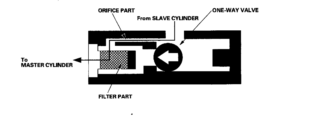 When the clutch pedal is released, the fluid pressure from the slave cylinder moves the one-way valve in the direction shown in the illustration. The one-way valve blocks the filter-part passage and delays the clutch release speed by returning the fluid to the master cylinder through only the orifice-part passage.