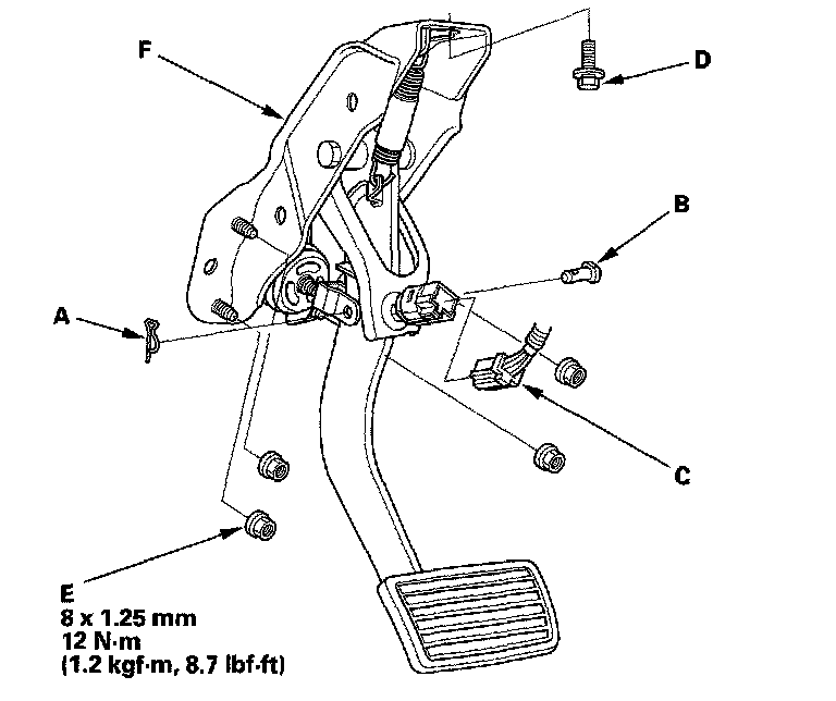 3. Remove the brake pedal bracket mounting bolt (D) and nuts (E).