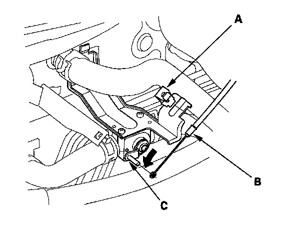 4. From under the hood, open the cable clamp (A), then disconnect the heater valve cable (B) from the heater valve arm (C). Turn the heater valve arm to the fully opened position as shown.