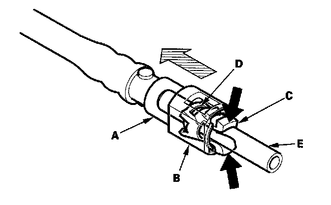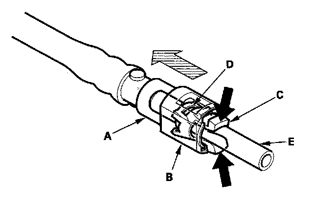 16. Disconnect the quick-connect fitting (A): Hold the connector (B) with one hand, and squeeze the retainer tabs (C) with the other hand to release them from the locking tabs (D). Pull the connector off.