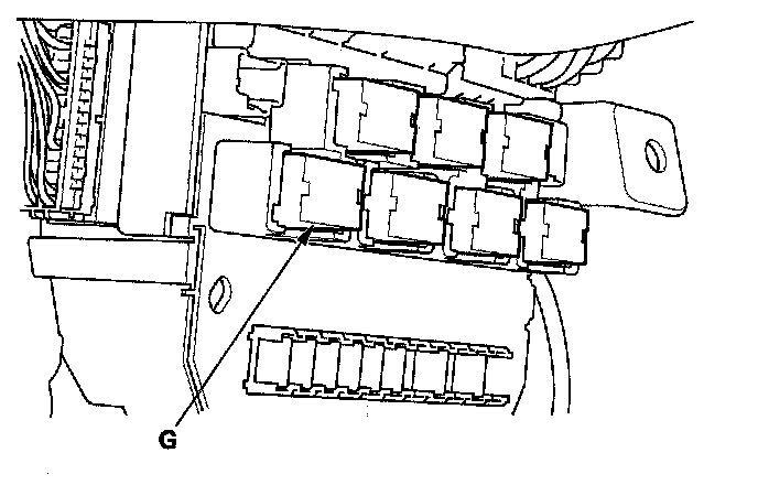 2. Remove the left kick panel, then remove PGM-FI main relay 2 (G) from the under-dash fuse/relay box.