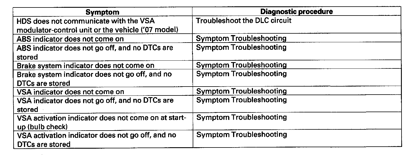 When the vehicle has one of these symptoms, check for a diagnostic trouble code (DTC) with the HDS. If there is no DTC, do the diagnostic procedure for the symptom, in the sequence listed, until you find the cause.