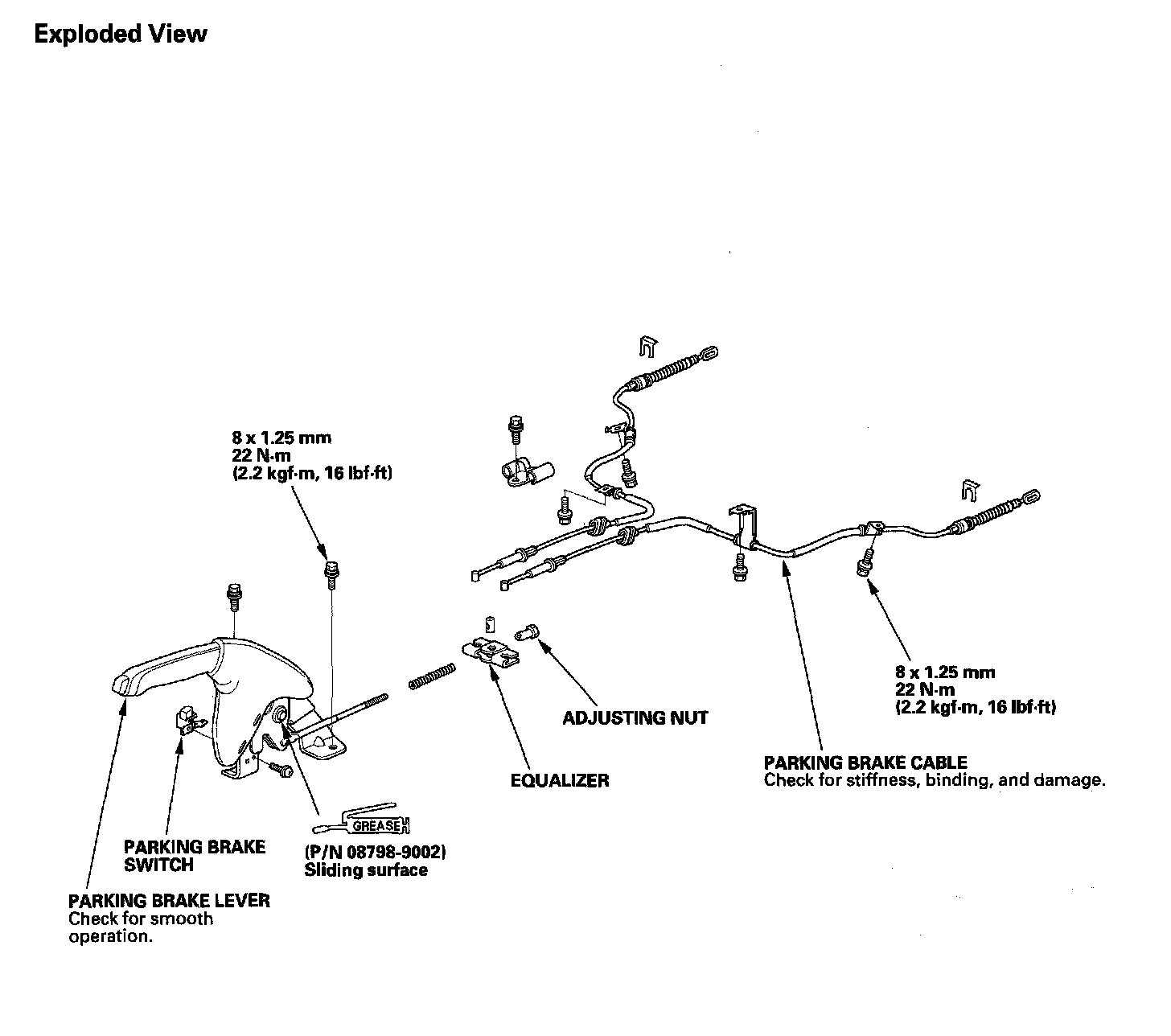 ^ The parking brake cable must not be bent or distorted. This will lead to stiff operation and premature cable failure.
