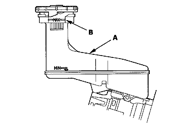 1. Make sure the brake fluid level in the reservoir (A) is at the MAX (upper) level line (B).