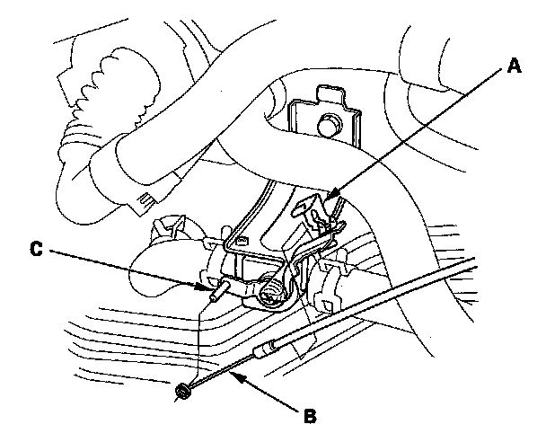 Heater Valve Cable Adjustment1. From under the hood, open the cable clamp (A), then disconnect the heater valve cable (B) from the heater valve arm (C).