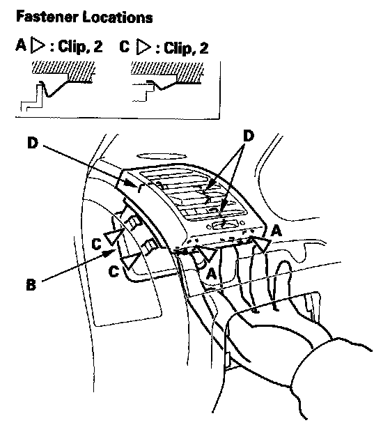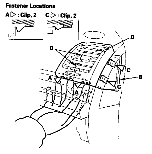 2. Push on the lower clips (A) by hand to release them. Then gently press up on the passenger's side vent (B) from the bottom to release the outer side clips (C). While gently pressing up on the passenger's side vent, pry the passenger's side vent towards the door opening to release the tabs (D).