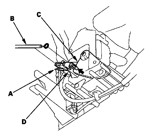 4. Attach the heater valve cable to the air mix control linkage as shown in step 2. Hold the end of the heater valve cable housing against the stop (D), then snap the heater valve cable housing into the cable clamp.
