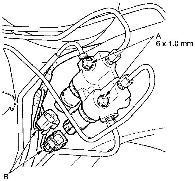 31. Remove the 4-way brake line joint bolts (A). Do not disconnect the lines. Then disconnect the brake pressure sensor connectors (B) (with ACC).