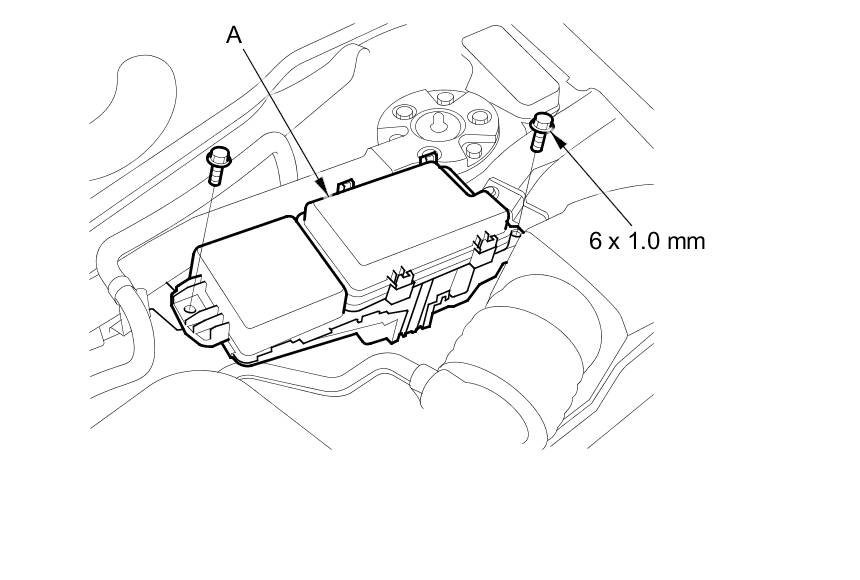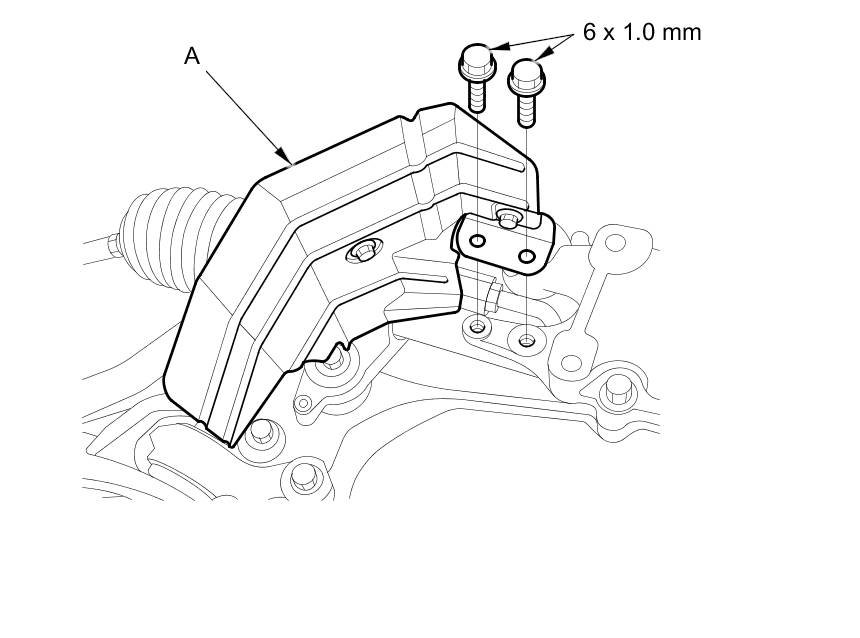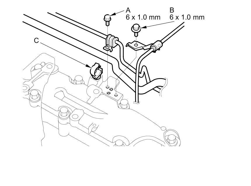 20. Remove the inlet line holder mounting bolt (A) and A/T shift cable holder mounting bolt (B) on the gearbox stiffener.