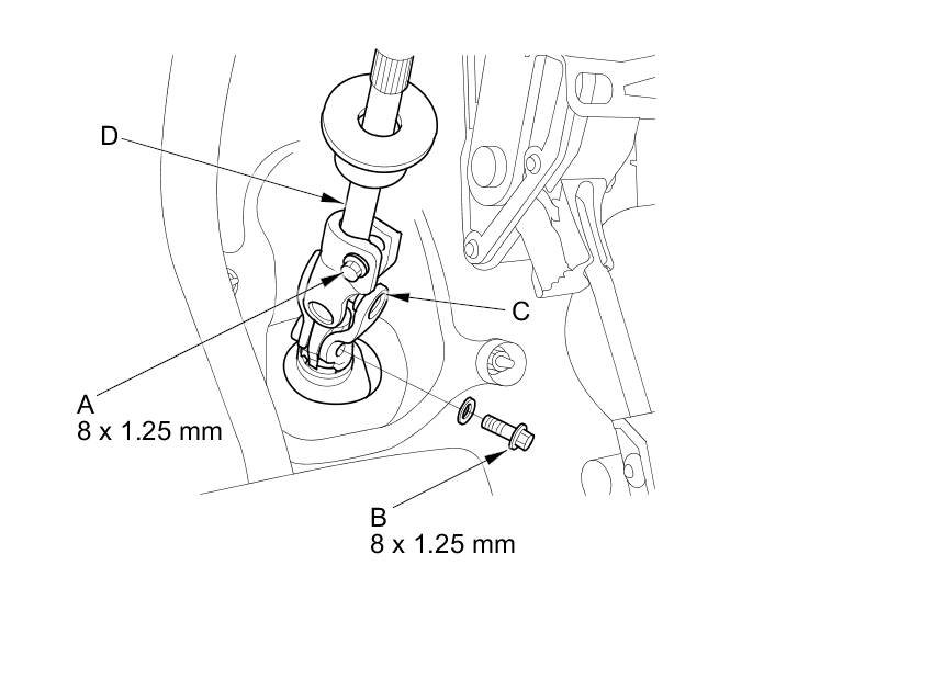 10. Loosen the upper steering joint bolt (A), and remove the lower steering joint bolt (B). Disconnect the steering joint (C) by sliding the steering joint into the steering shaft (D). Tighten the upper steering joint bolt to hold the steering joint in place.