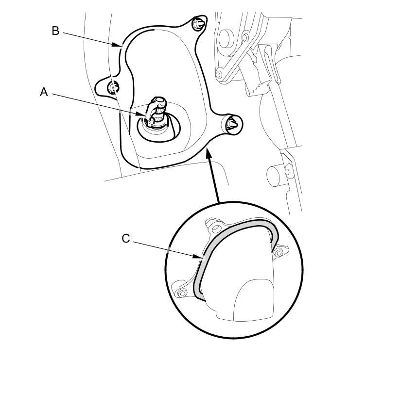 12. Remove steering joint cover B. Be careful not to damage the mating surface on joint cover and the pinion shaft grommet. Replace the cover seal (C) if necessary.