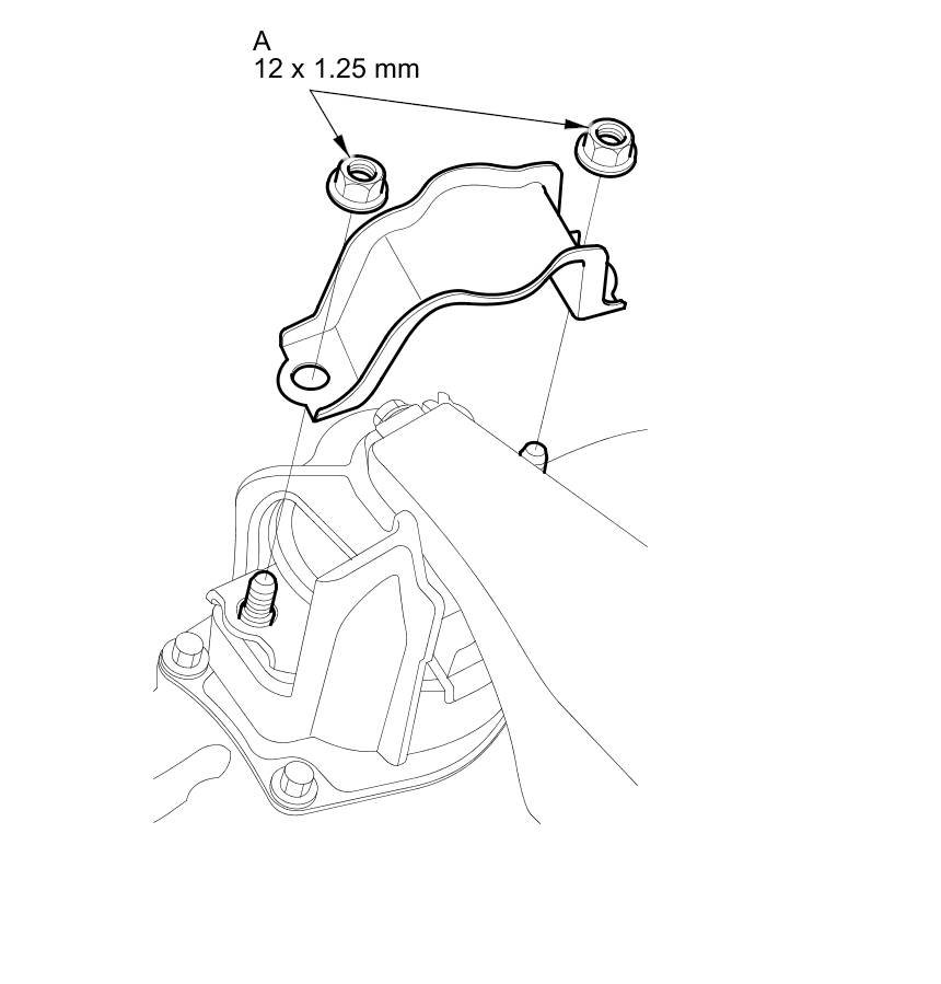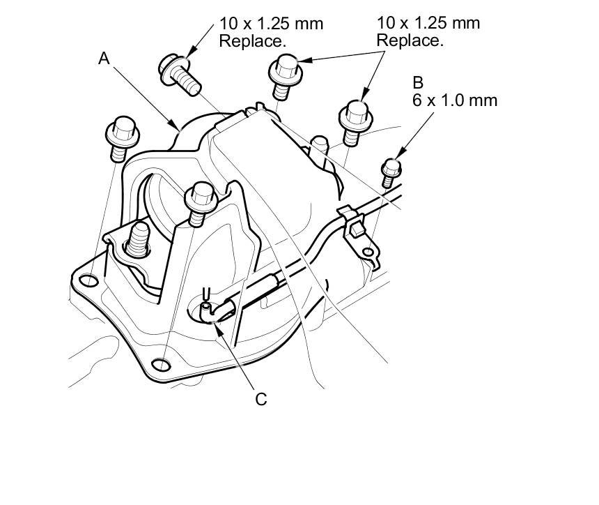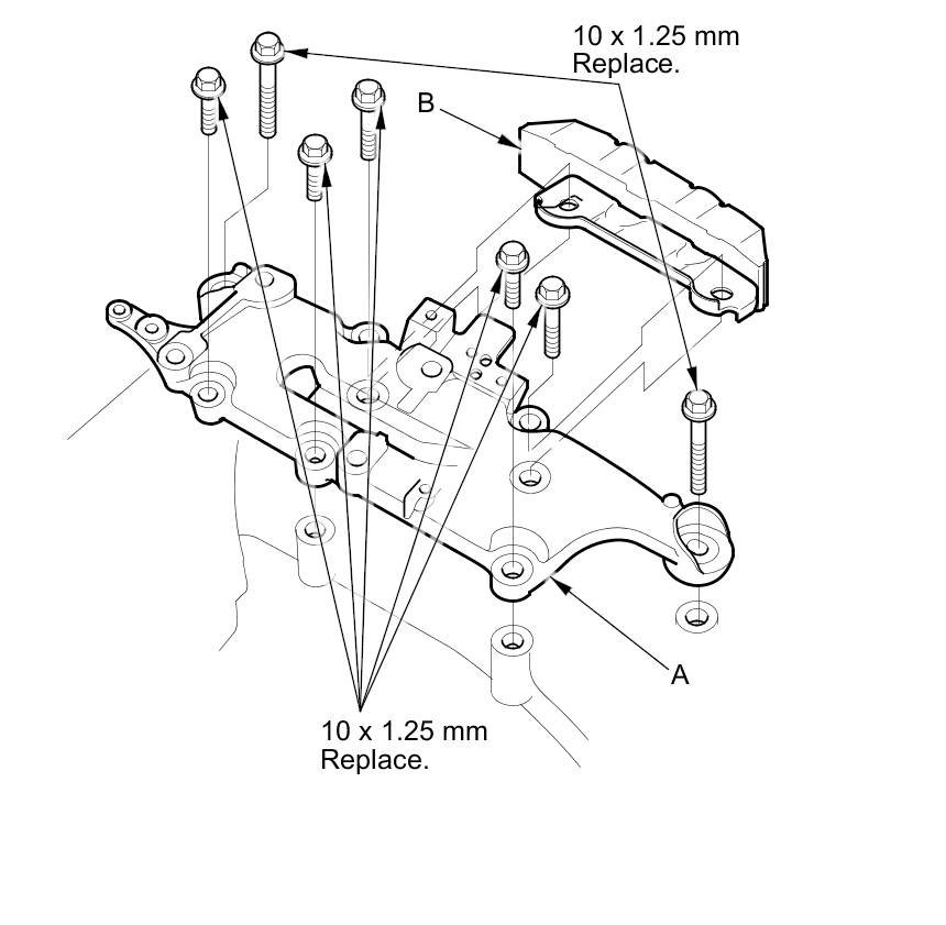 18. Remove the rear engine mount (A) and the engine mount vacuum hose holder mounting bolt (B) on the gearbox stiffener.
