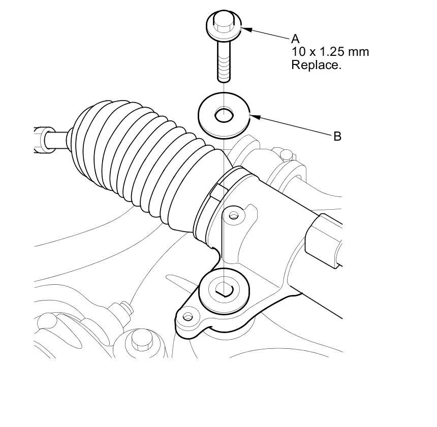 30. Remove the steering gearbox mounting bolt (A) and washer (B) from the driver's side gearbox mount.