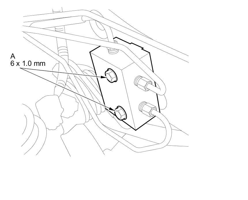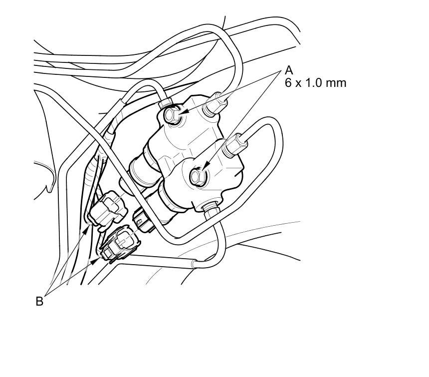 31. Remove the 4-way brake line joint bolts (A). Do not disconnect the lines. Then disconnect the brake pressure sensor connectors (B) (with ACC).