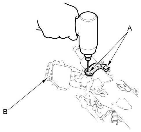 2. Center-punch both of the shear bolts (A), and drill their heads off with a 5 mm (0.20 in) drill bit. Be careful not to damage the steering lock (B) when removing the shear bolts.