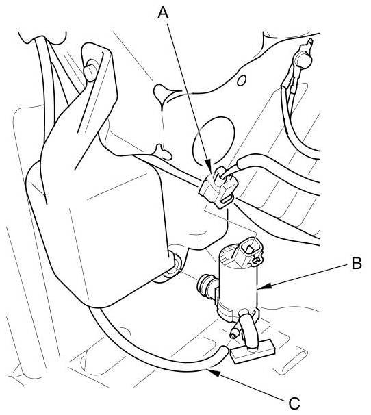 3. Disconnect the washer tube (C), then if necessary, remove the washer motor.