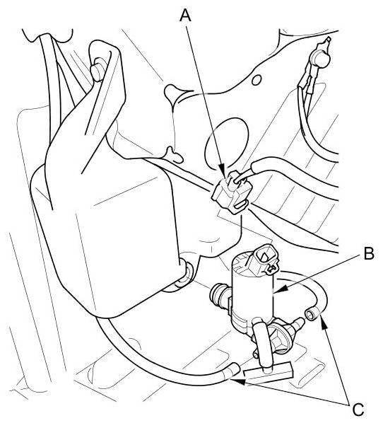 2. Disconnect the 2P connector(s) (A) from the windshield washer motor (B) and the washer fluid level switch (C).
