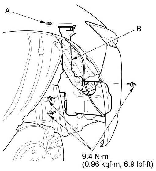 4. Remove the clip (A) and three bolts from the washer reservoir (B).