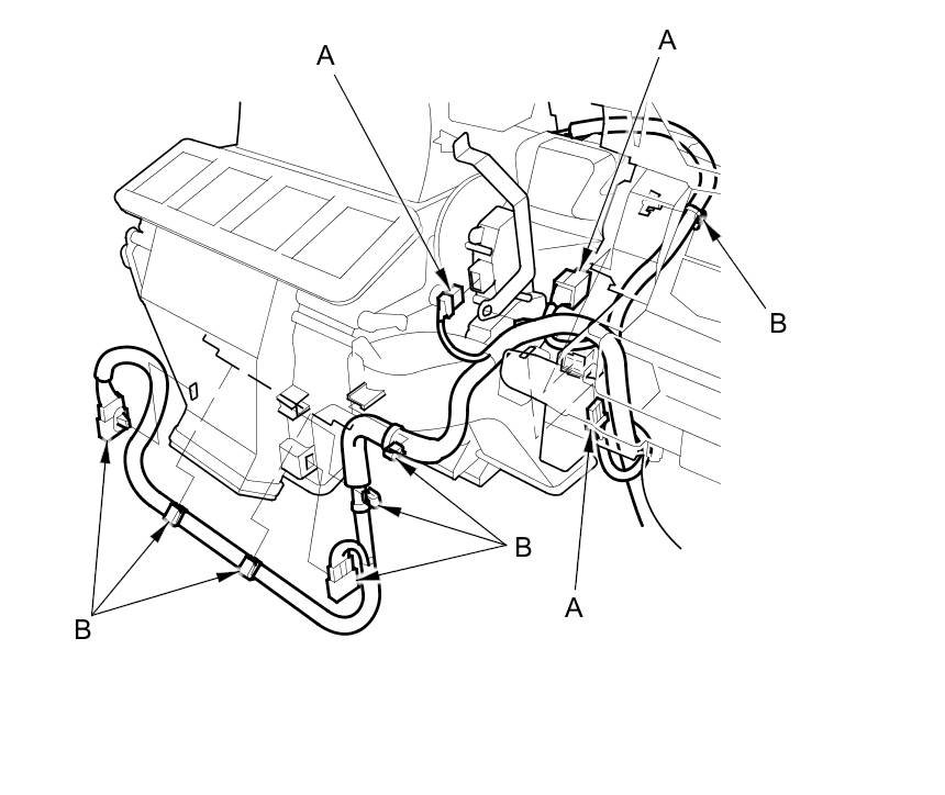 9. Disconnect the connector (A) from the blower motor. Detach the harness clips (B).
