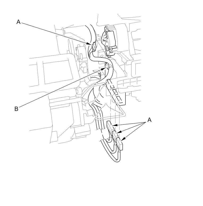11. Disconnect these connectors (A): The recirculation control motor, and the climate control unit. Detach the harness clip (B).