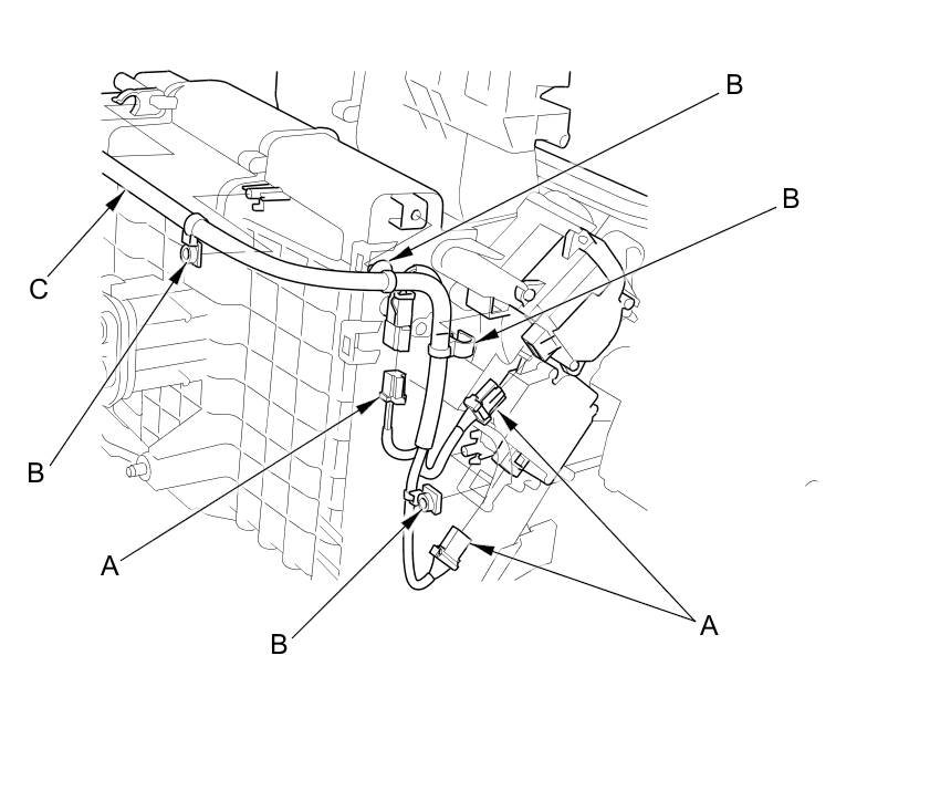 5. From under the hood, slide the hose clamps (A) back. Disconnect the inlet heater hose (B) and the outlet heater hose (C) from the heater unit. Note the layout of the hoses.