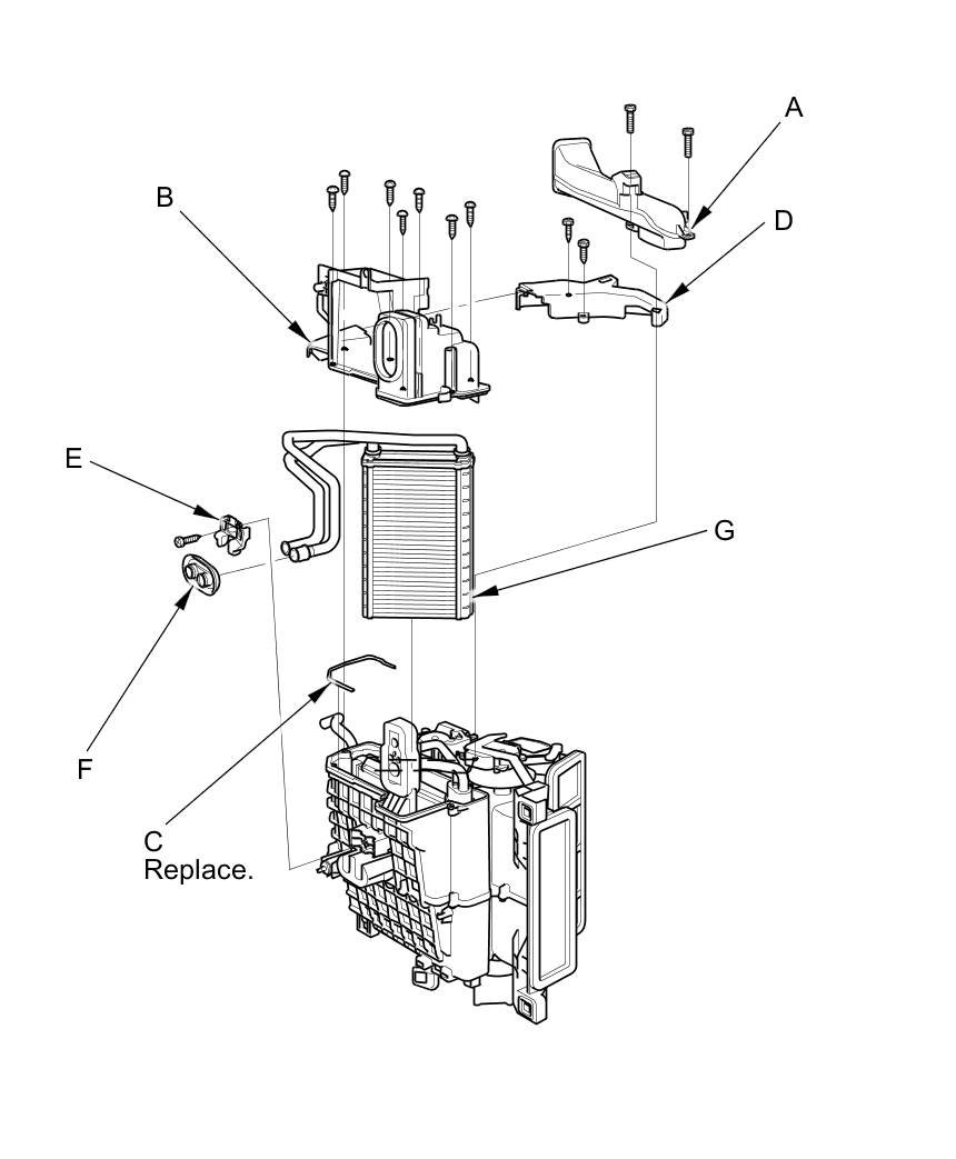 14. Remove the self-tapping screw, the heater pipe bracket (E), and the grommet (F), and carefully pull out the heater core (G).