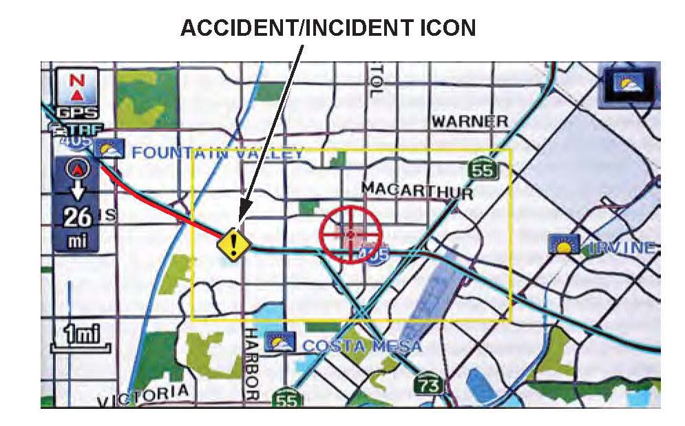 ^ Small diamond-shaped "traffic incident" icons may be shown. If so, scroll over an icon and press in the interface dial to see the details.