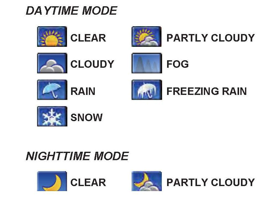 XM Radio offers XM weather that shows current local weather as weather icons on the map screen. These are different from weather related traffic incident icons. Here are examples of the weather icons:
