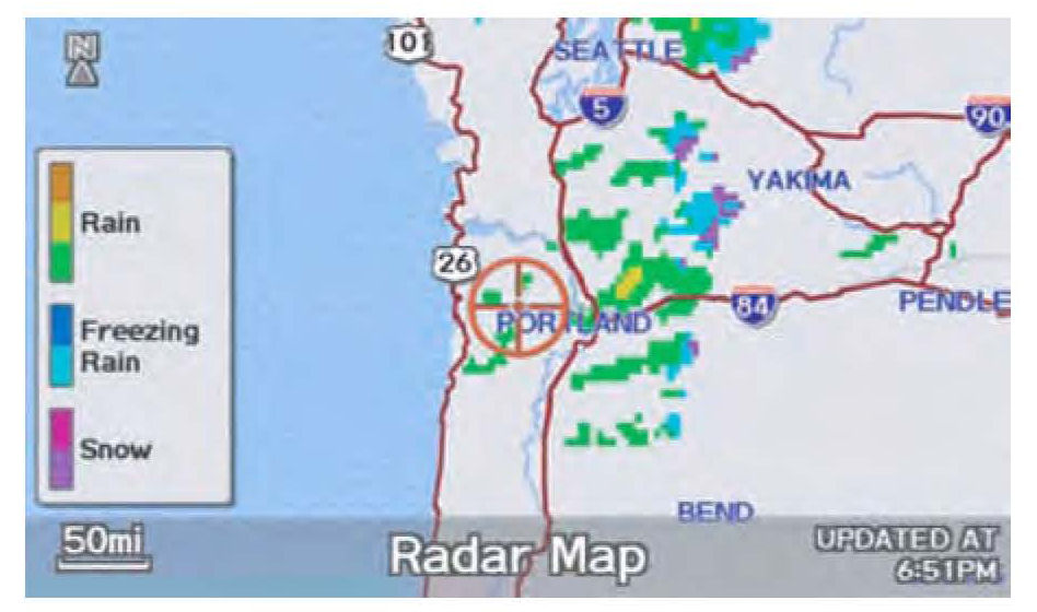 To see the weather radar image map, say or select Radar Map. The display changes to show the weather radar image map for the selected area.