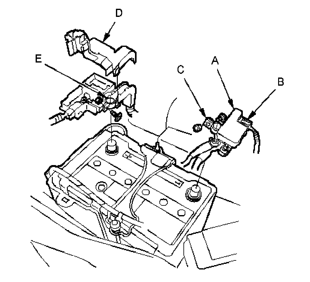 4. Disconnect the positive cable and the battery terminal (E) from the battery.
