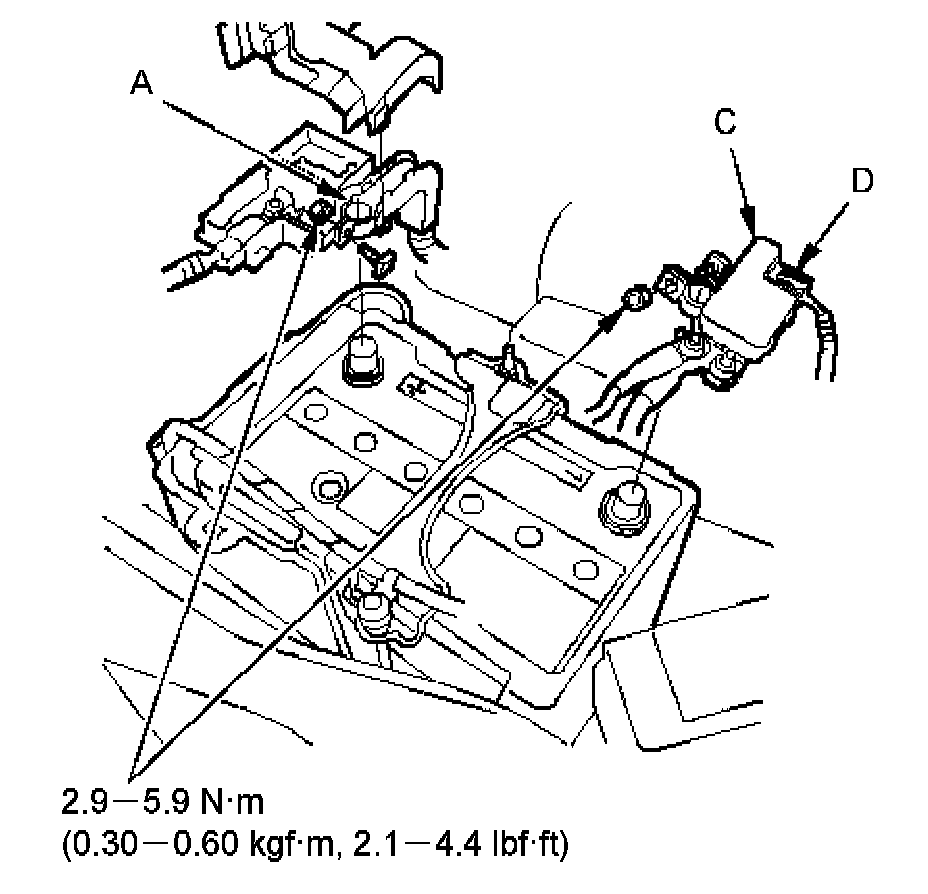 ^ Do not disconnect the battery sensor from the negative terminal (C).