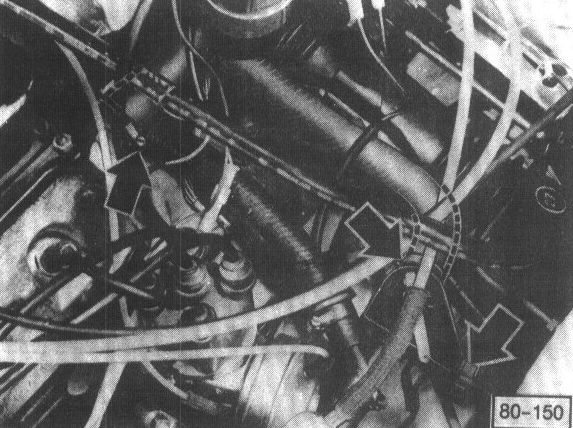 - pull off coolant hoses for heat exchanger (left and center arrows)