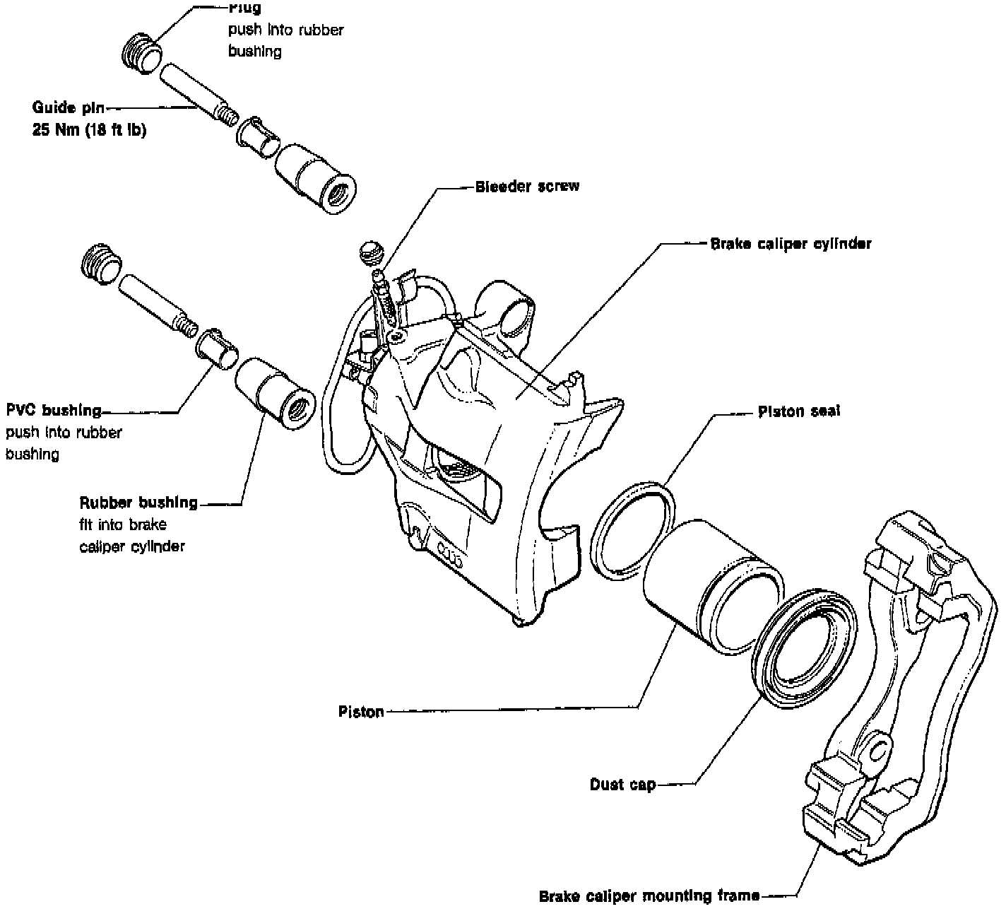 7. Torque brake caliper housing guide pins to 25 Nm (18 ft.lbs.), then install bolt caps.
